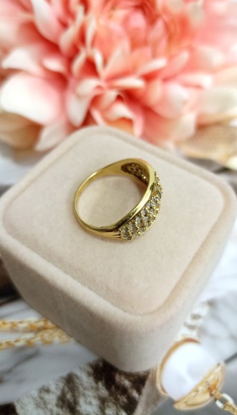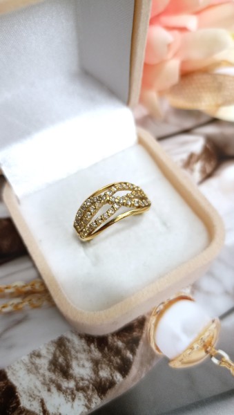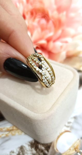 Przedmiotem sprzedaży jest pierścionek z cyrkoniami wykonany z 14-karatowego, żółtego złota.