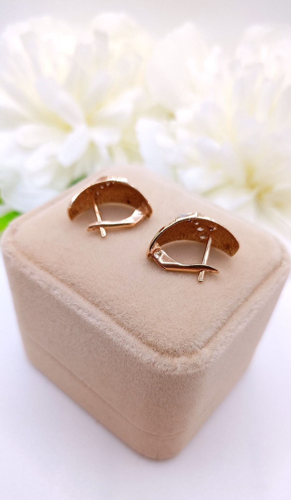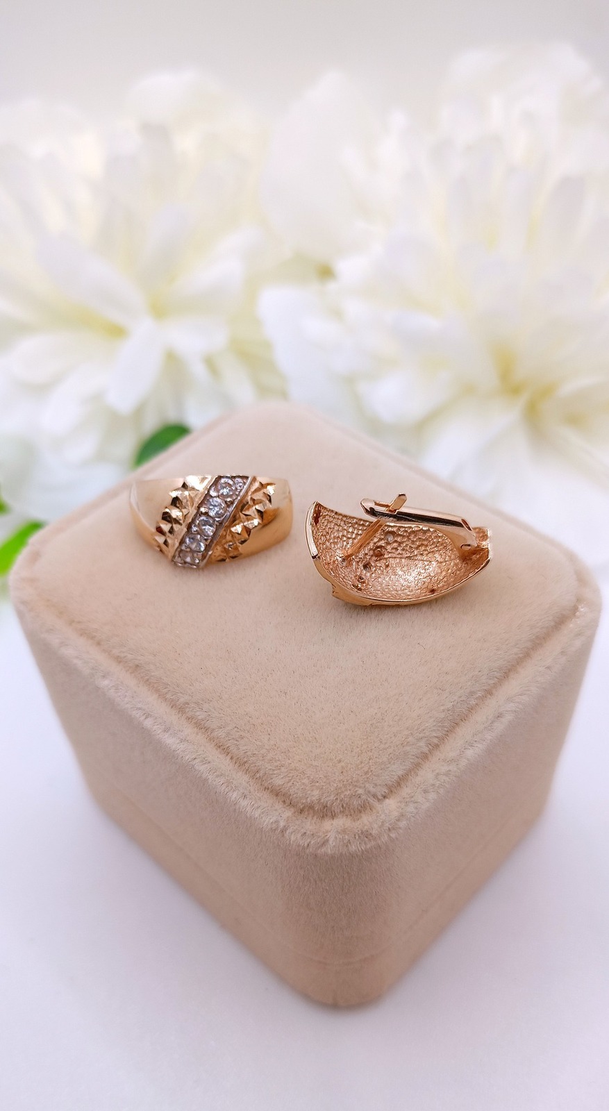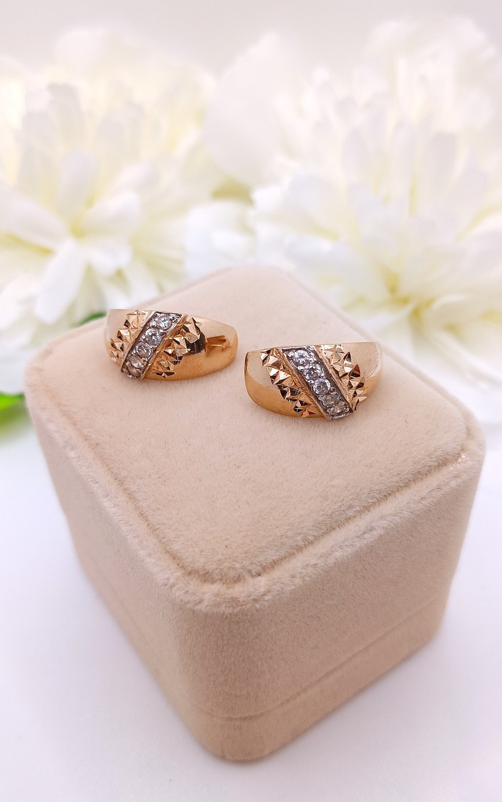 Oferujemy na sprzedaż złote kolczyki wykonane z 14-karatowego (p.585) różowego złota.