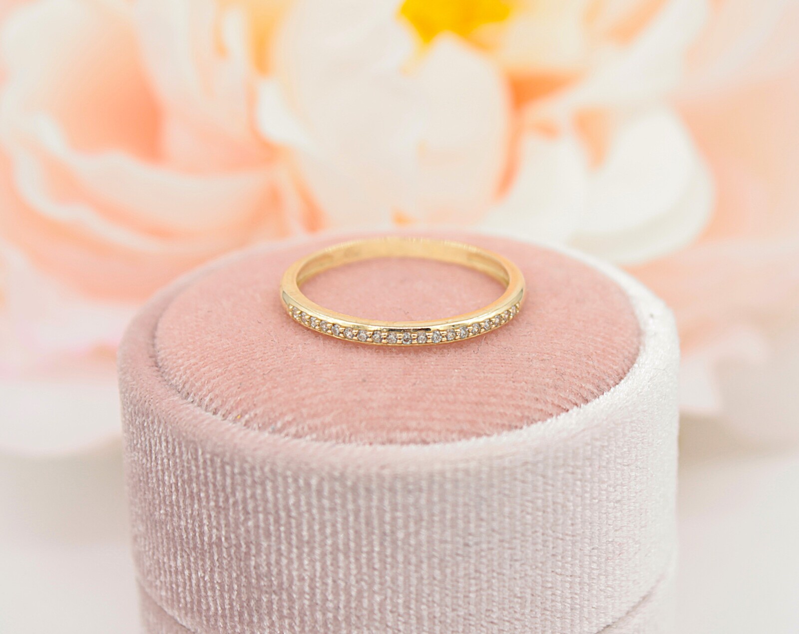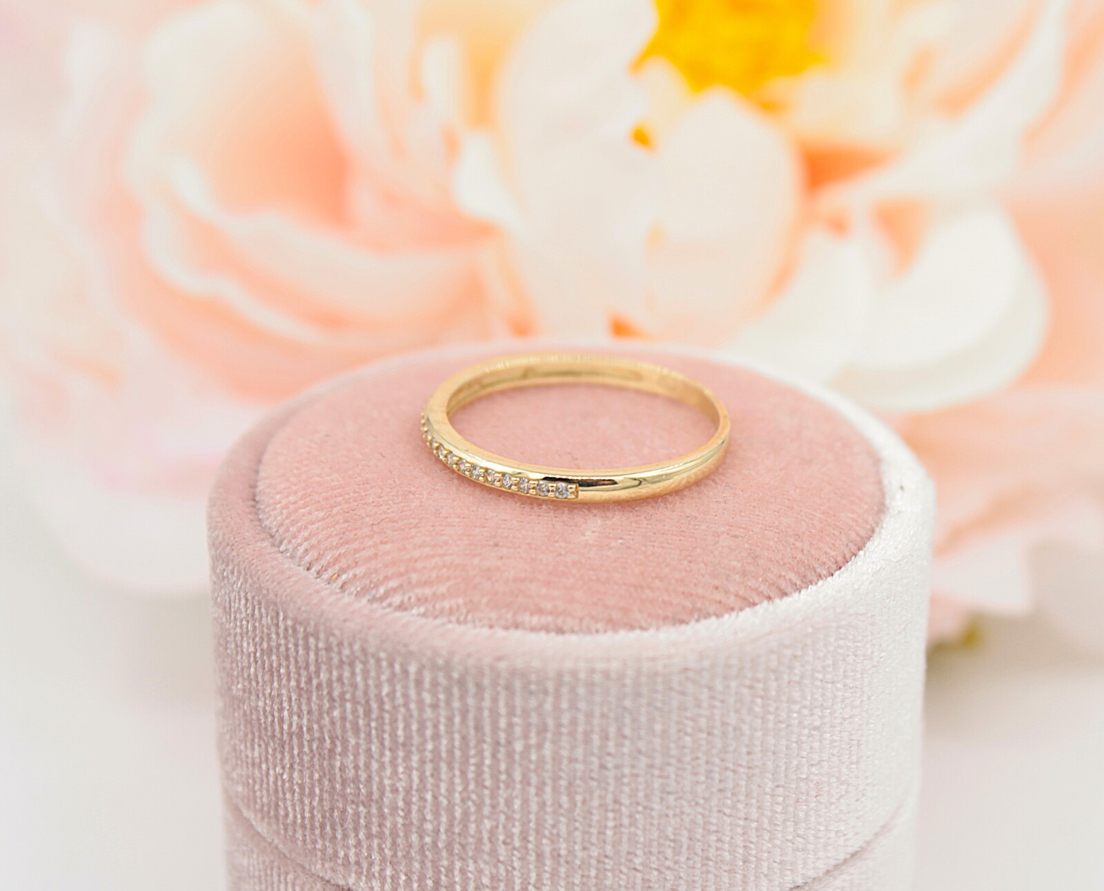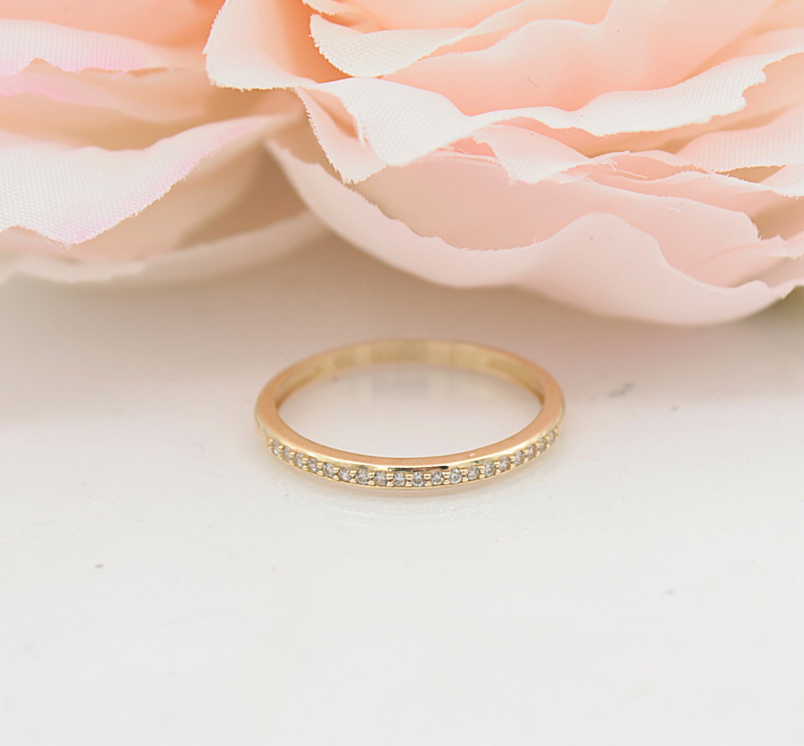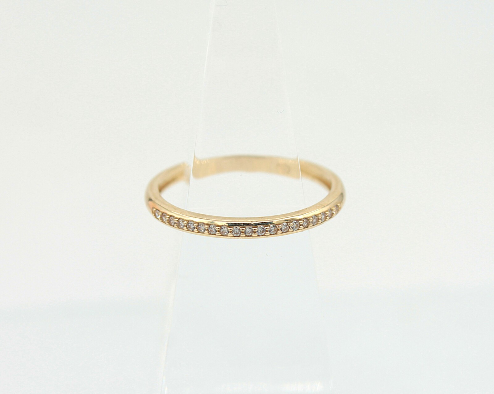 Oferujemy na sprzedaż złoty pierścionek/obrączkę z cyrkoniami, wykonany z 14-karatowego (p.585) żółtego złota.