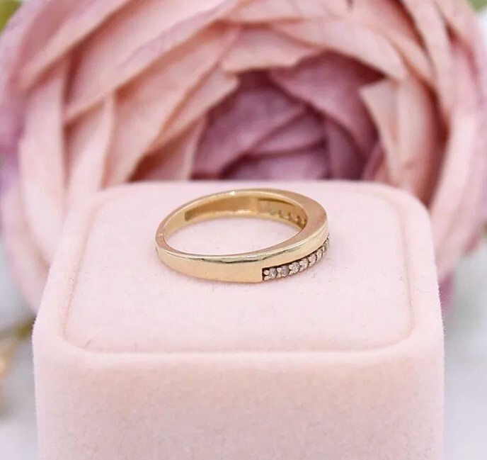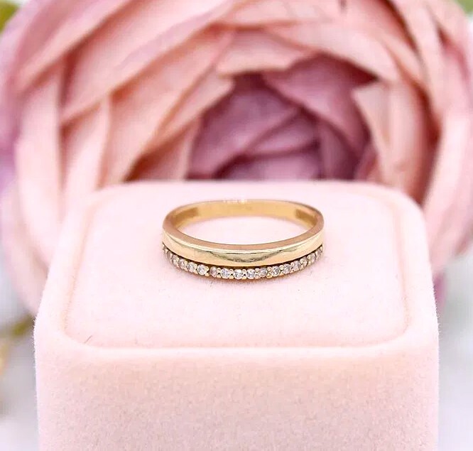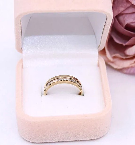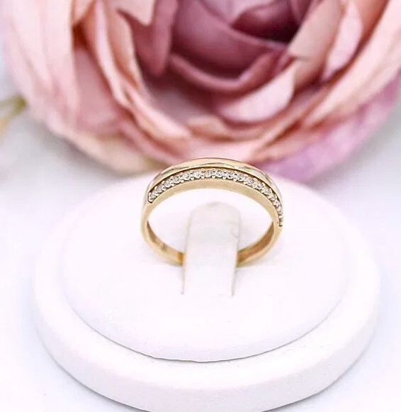 Oferujemy na sprzedaż złoty pierścionek/obrączka z cyrkoniami, wykonany z 14-karatowego (p.585) żółtego złota