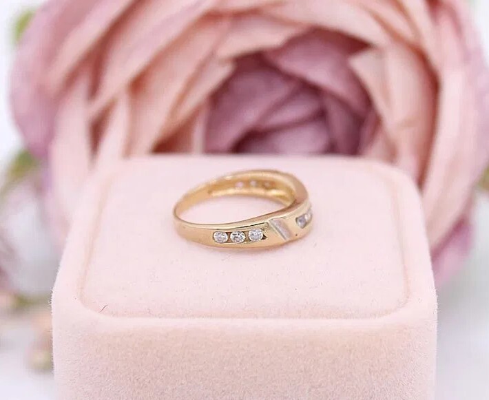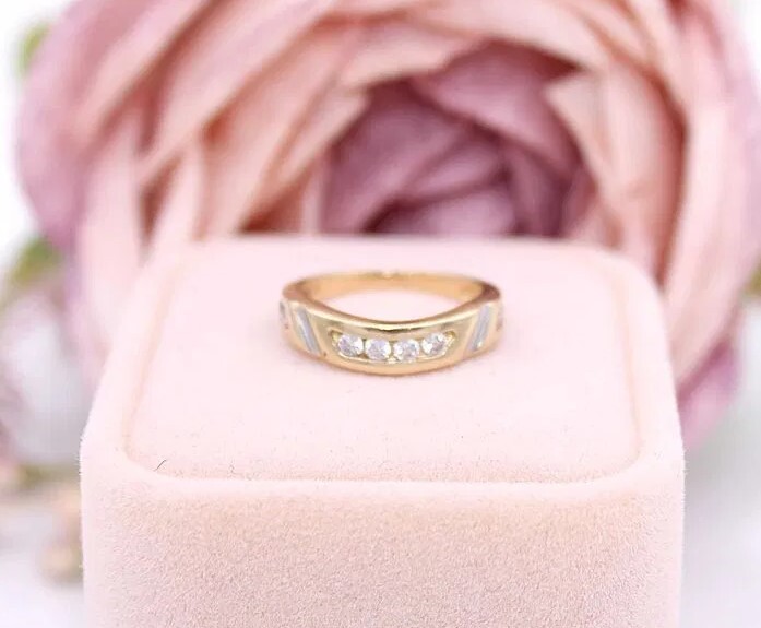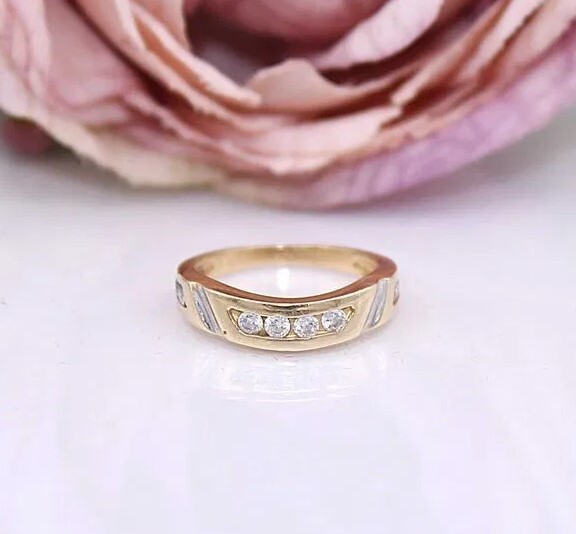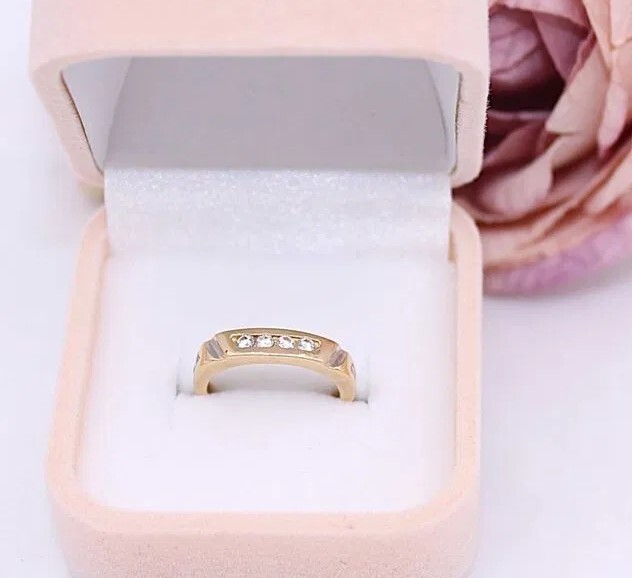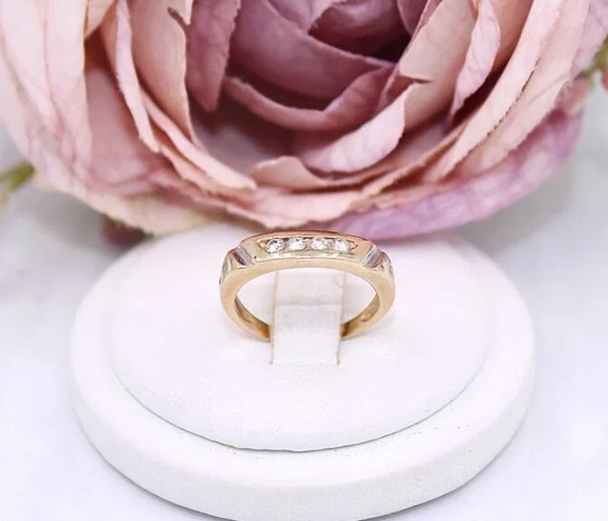 Oferujemy na sprzedaż złoty pierścionek z cyrkoniami, wykonany z 14-karatowego (p.585) żółtego złota