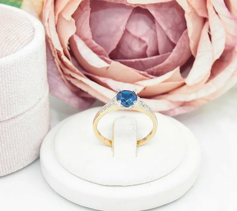 Oferujemy na sprzedaż złoty pierścionek z granatowym kamieniem i cyrkoniami, wykonany z 14-karatowego (p.585) żółtego złota.