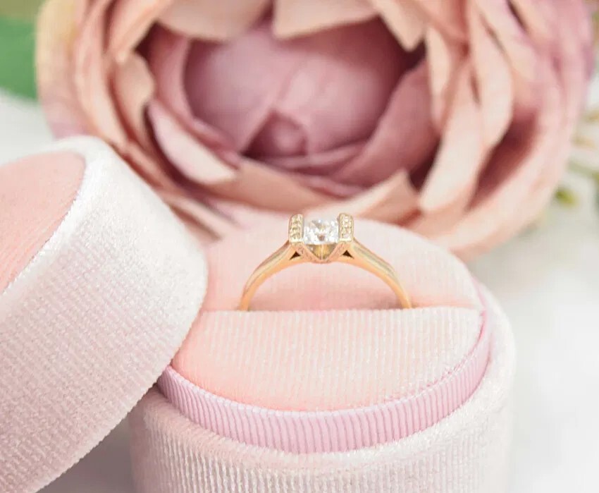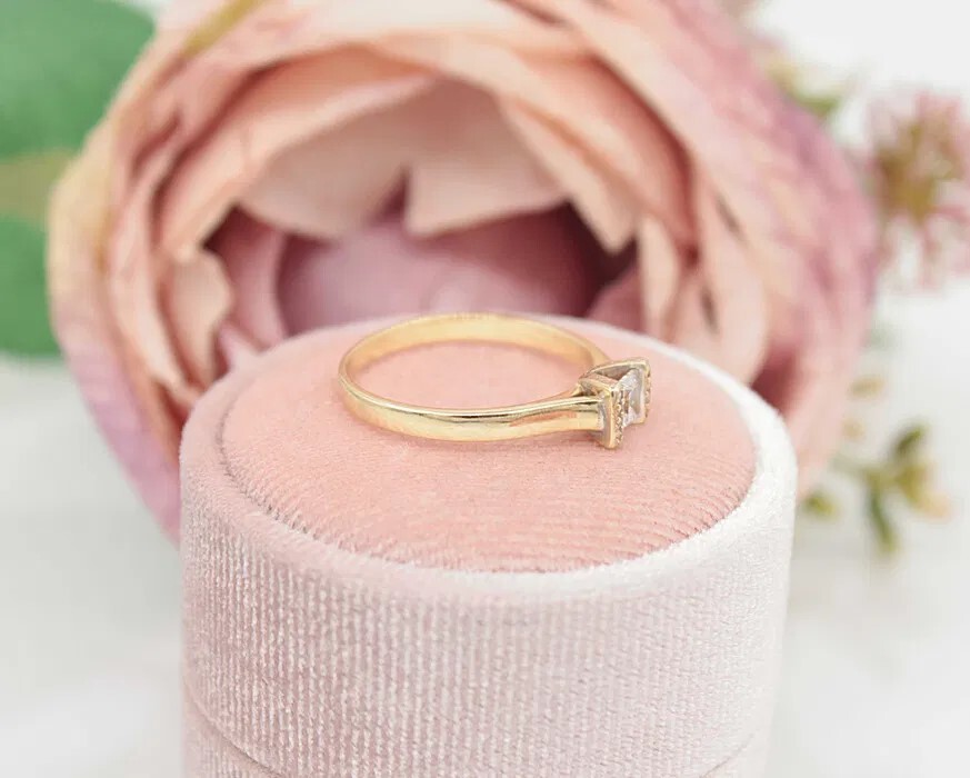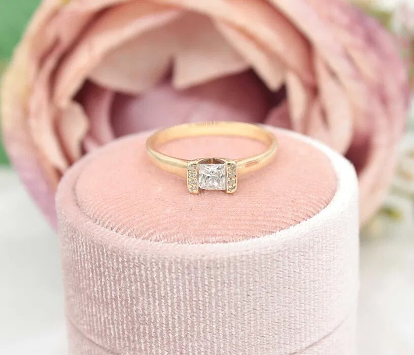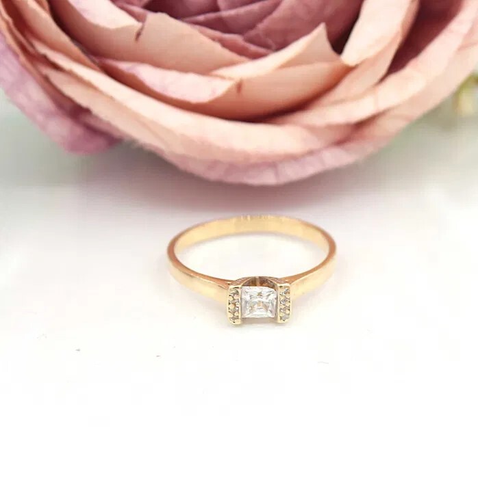 Oferujemy na sprzedaż złoty pierścionek z cyrkoniami, wykonany z 14-karatowego (p.585) żółtego złota.