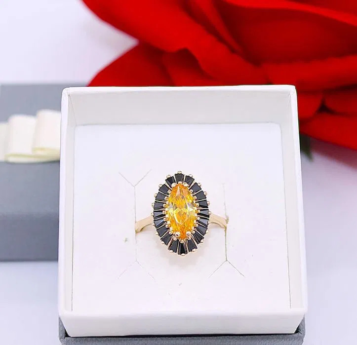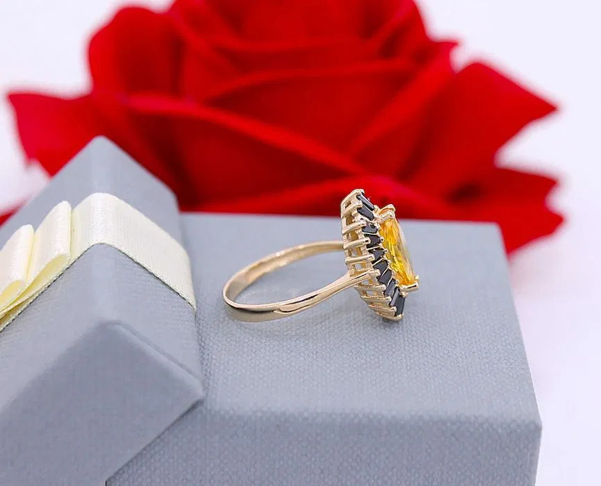 Oferujemy na sprzedaż złoty pierścionek z żółtym i czarnymi kamieniami, wykonany z 14-karatowego (p.585) żółtego złota.