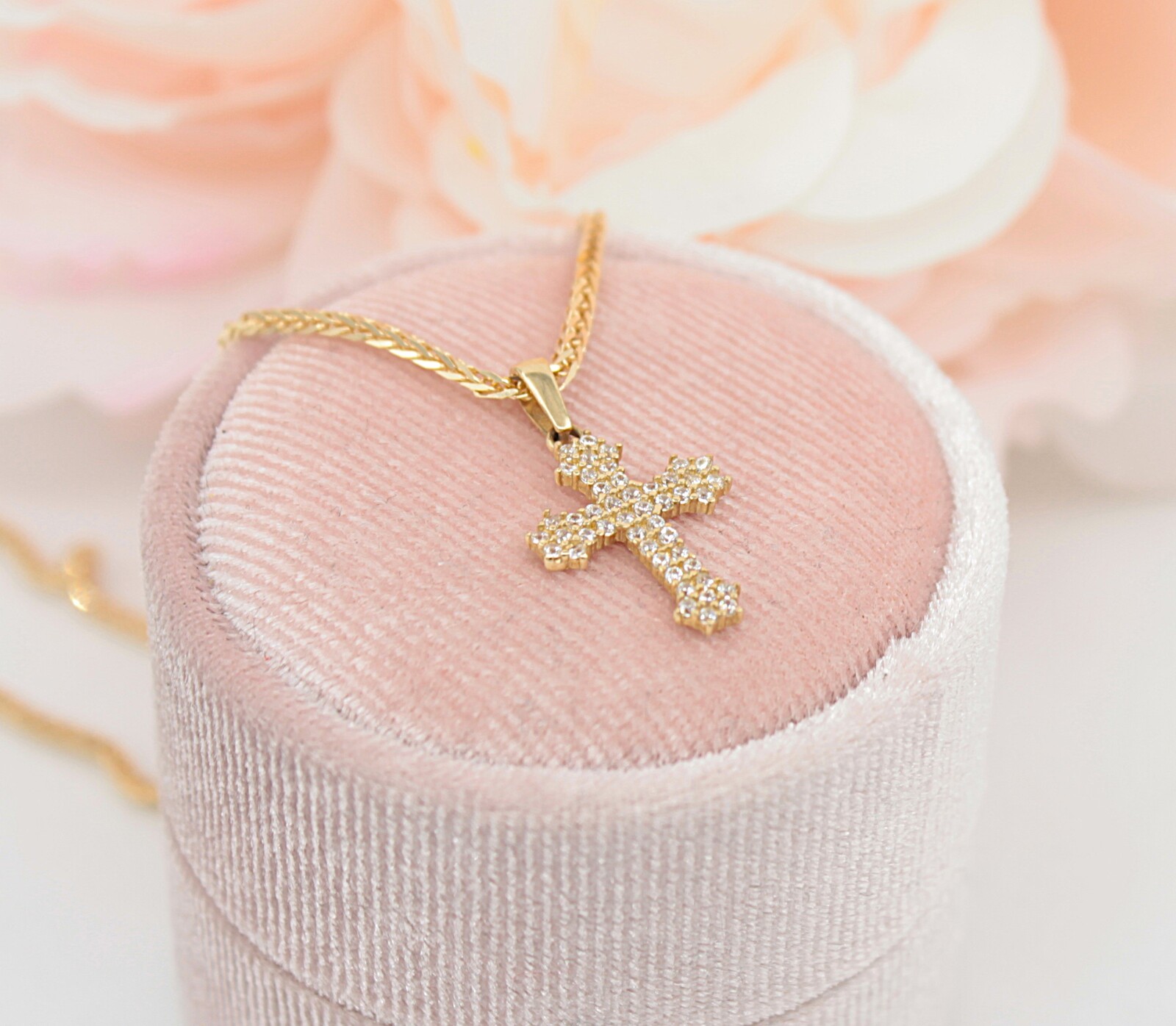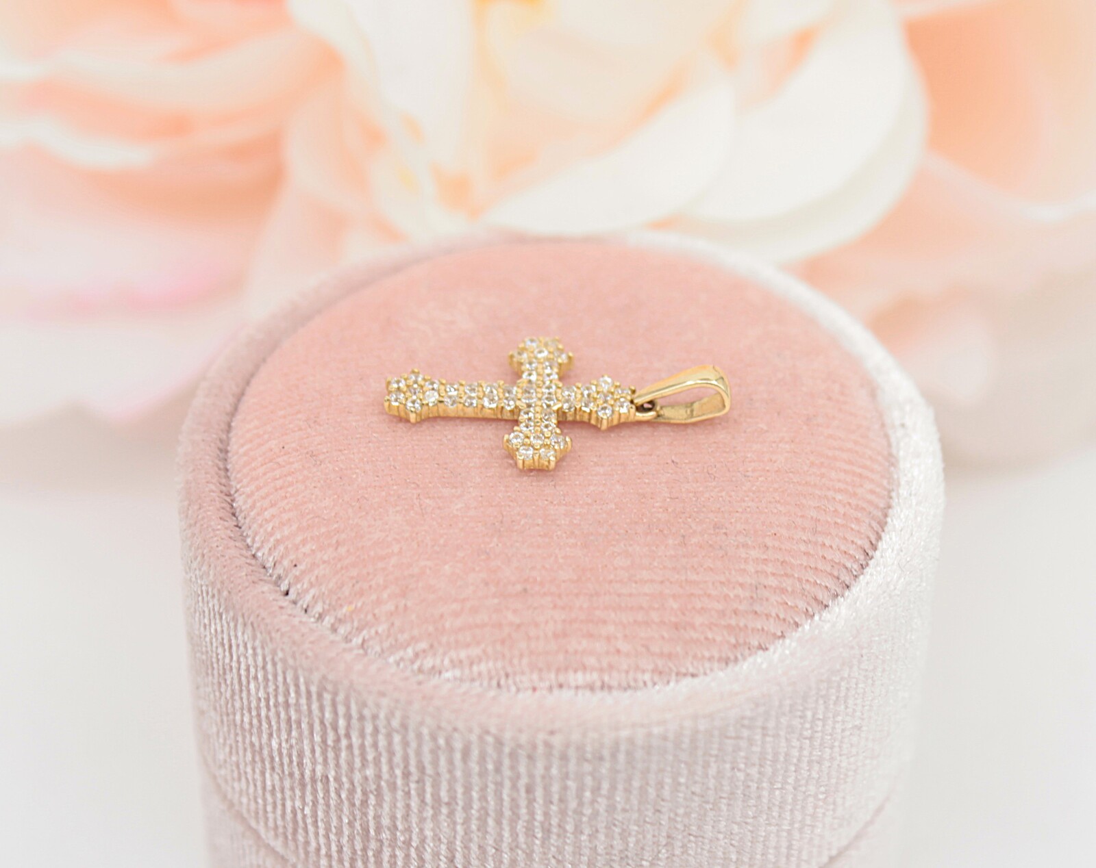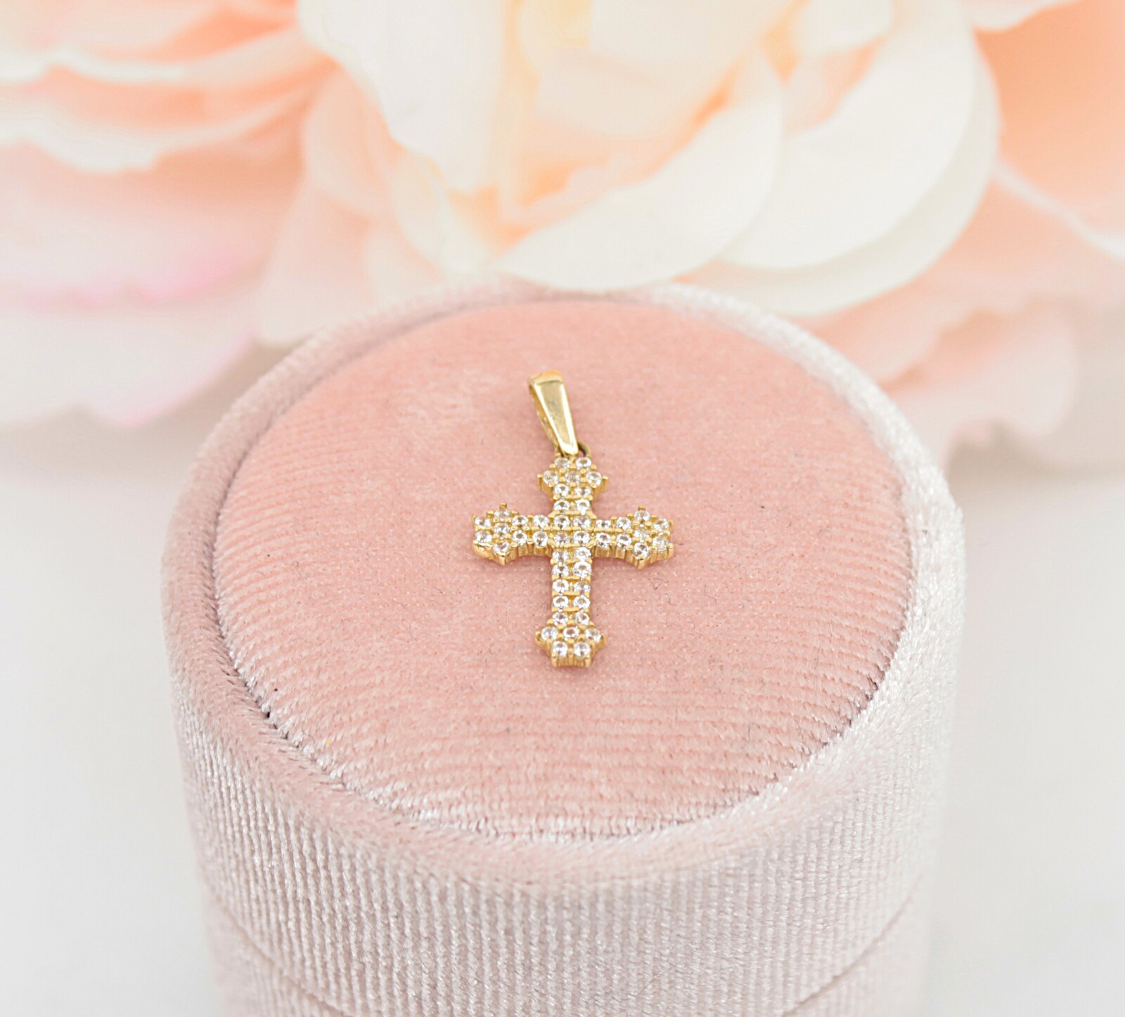 Oferujemy na sprzedaż złotą zawieszkę - Krzyż, wysadzany cyrkoniami, wykonaną z 14-karatowego (p.585) żółtego złota.